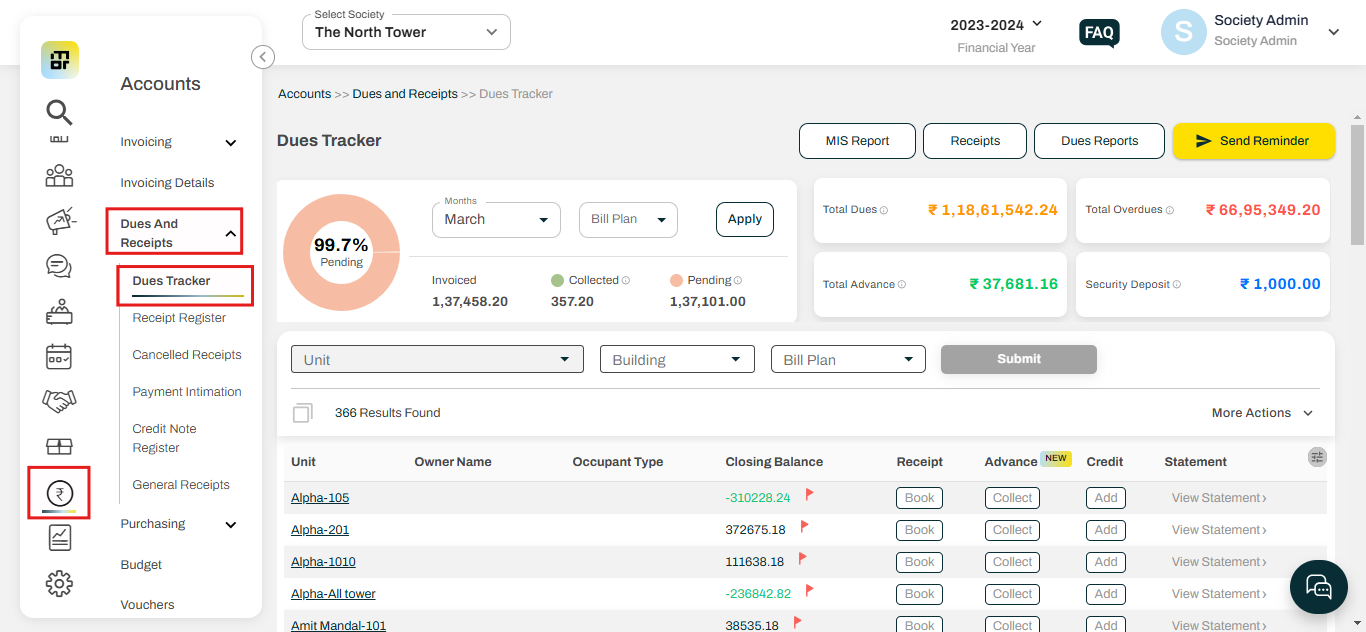 1. Go to the "Dues Tracker" option under the Dues and Receipts section of the Accounts tab.