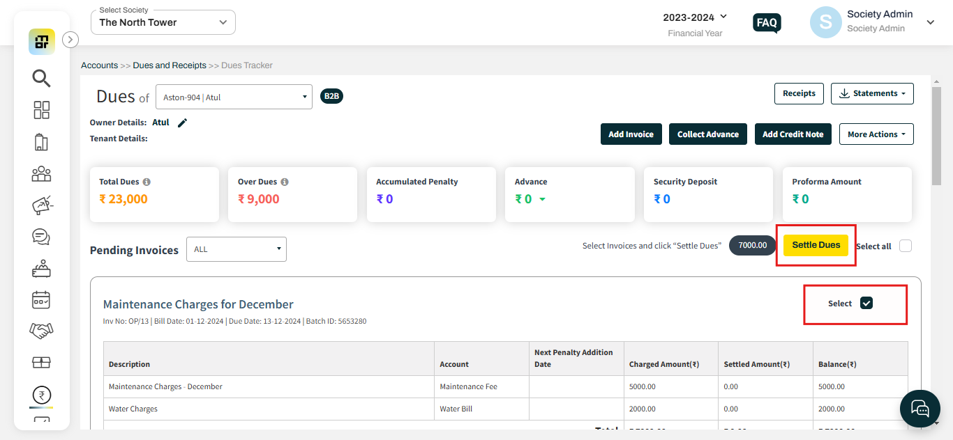 3. Click on the check box under the Pending Invoice section then click on Settle Dues.