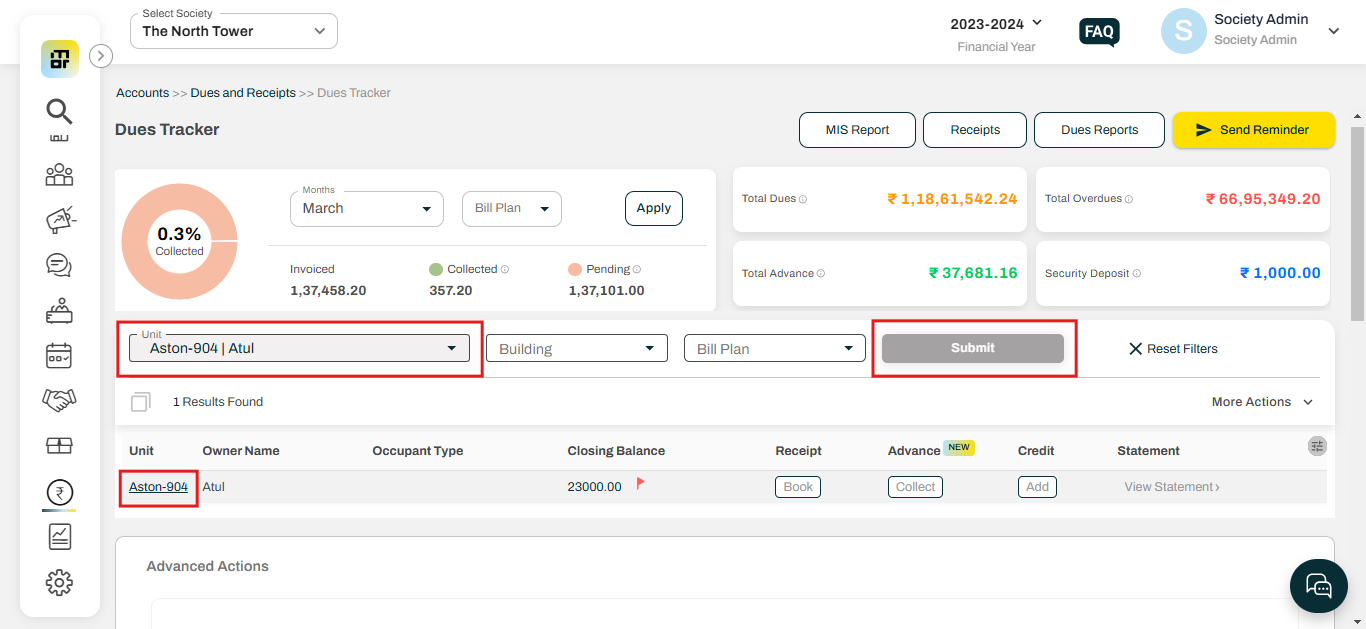 2. Filter the flat number from the Unit drop-down, then click on submit. Click on the Flat hyperlink in the result section.