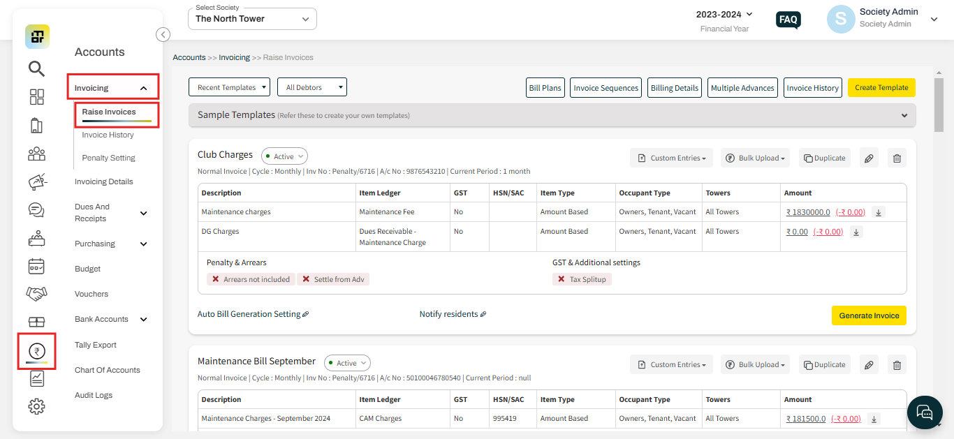 Society Admin can rearrange the order of items that appear in an invoice by below steps: