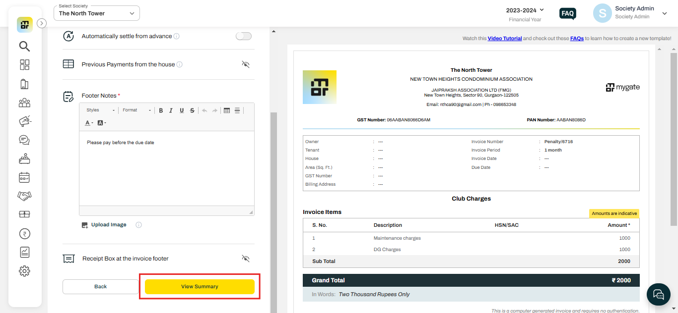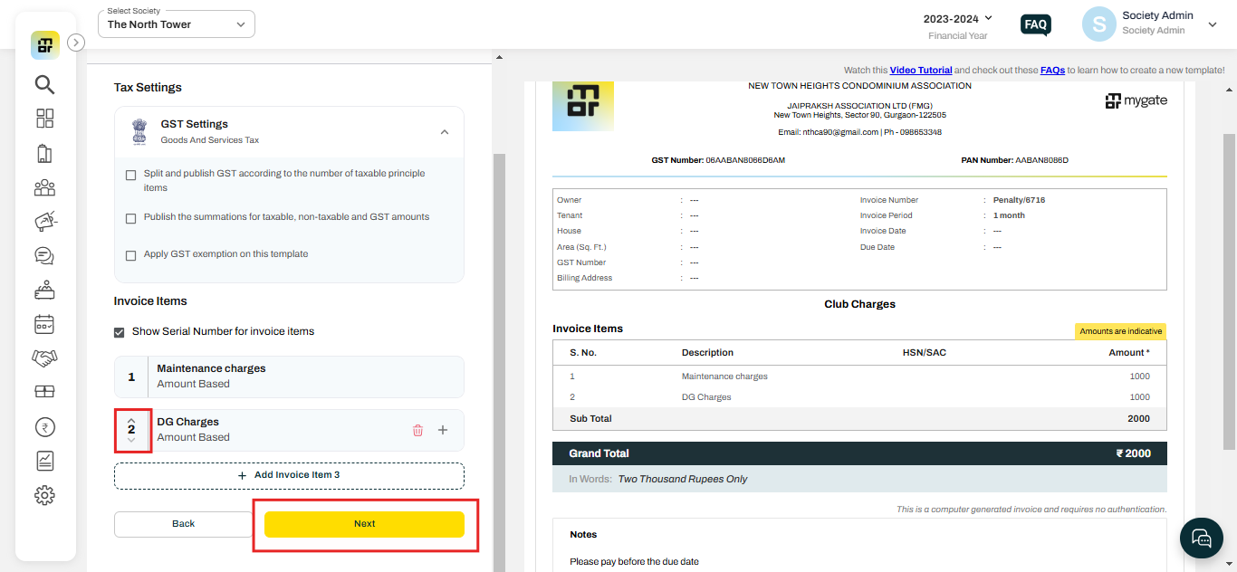 In Mygate, society admins have the flexibility to rearrange the order of invoice items within an invoice template. This helps present charges in a more logical or priority-based sequence, such as listing maintenance fees first, followed by utility charges or additional services. Organizing invoice items clearly improves readability for residents and ensures a more professional-looking invoice.