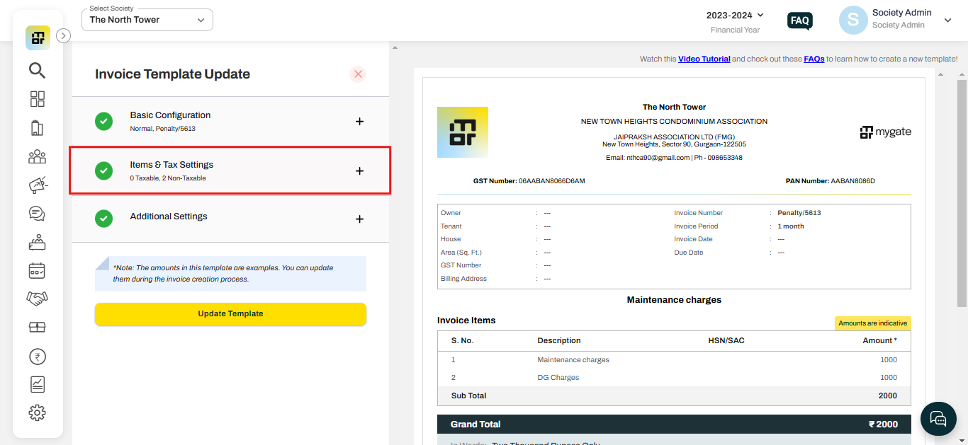 In Mygate, GST exemption is one of the GST settings where GST can be exempted for invoices as per the exemption threshold amount set. Hence, GST will be applicable only if the total of GST items exceeds the threshold limits. Steps to be followed to set GST exemption in the invoice template: