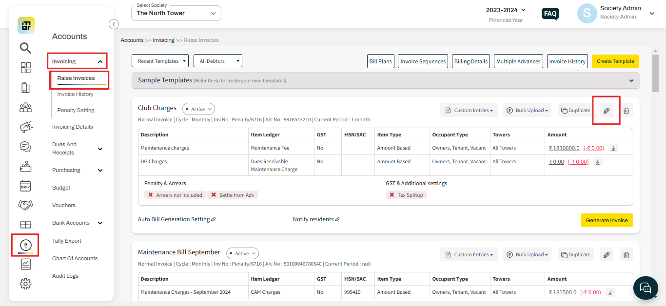 1. Go to the "Raise invoices" option under the invoicing section of the Accounts tab, and click on the Pencil Icon against the template that you wish to edit.