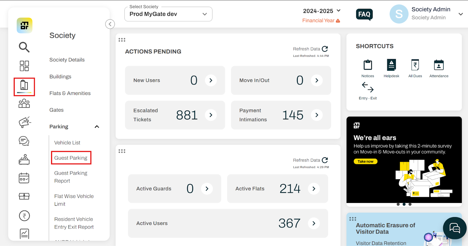 Mygate's Guest Parking feature simplifies visitor parking management for societies. Society admins can create virtual parking slots on the MyGate dashboard, which are then synced to the guard app. While making any visitor entry, guards can easily assign these slots to guest vehicles, ensuring efficient parking management. The feature also provides a detailed report of guest vehicle numbers and assigned parking slots.