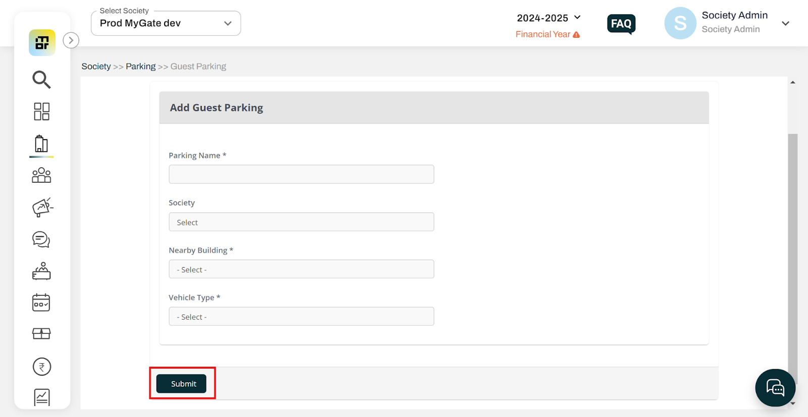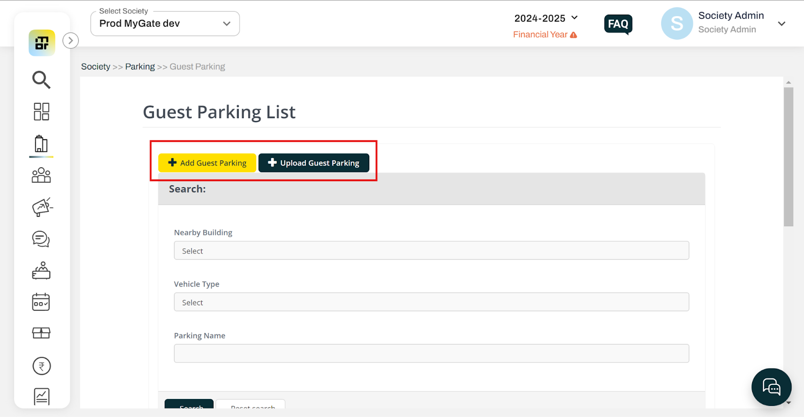 1. Click on the “Guest Parking” option under the Parking section in the Society tab.
