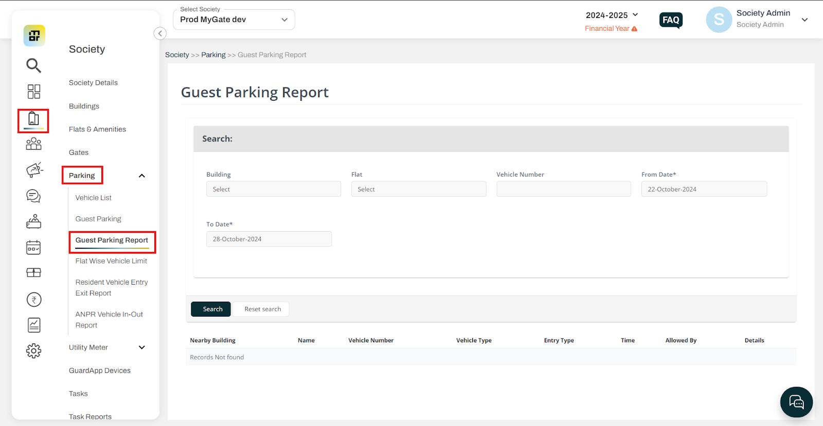 To view the report of vehicle entries marked in the respective slot please select the "Guest Parking Report" from the parking section under the society tab.