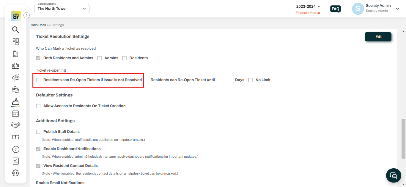2. Select the "Residents can Re-Open Tickets if the issue is not Resolved " option to allow the residents to reopen the tickets.