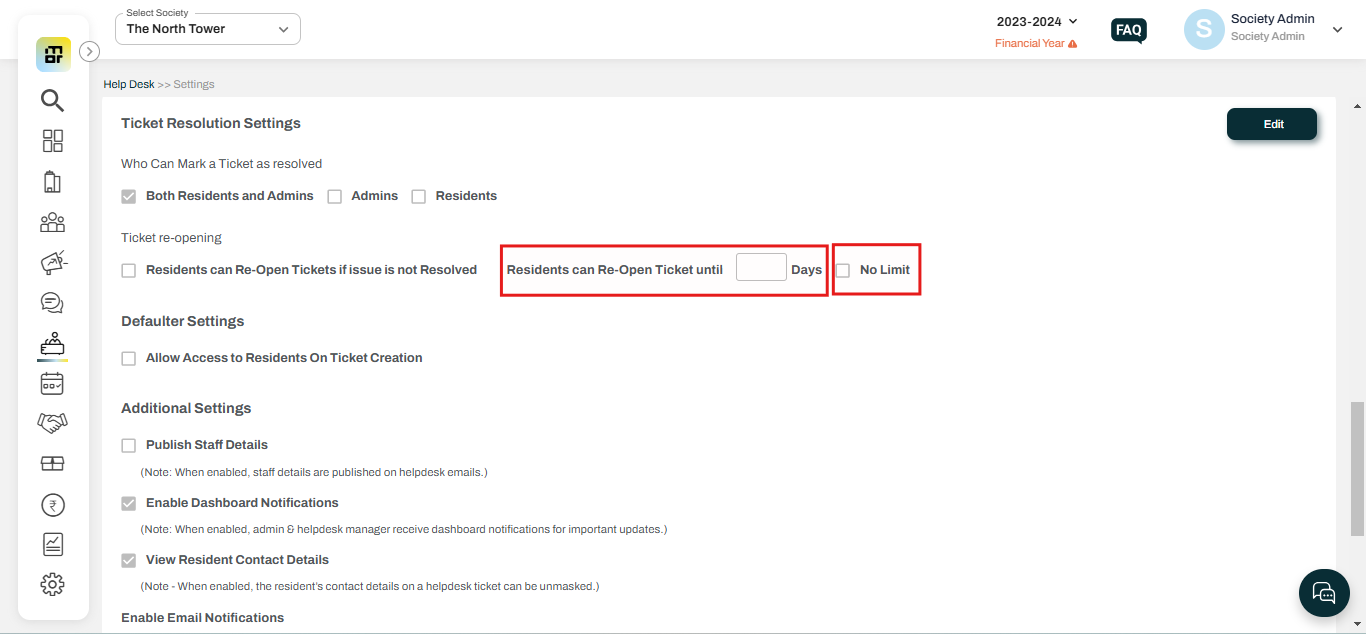 3. Select the "Residents can Reopen Tickets until" to set a specific limit on the number of days for reopening, or select 'No Limit' if you prefer not to impose any restrictions.