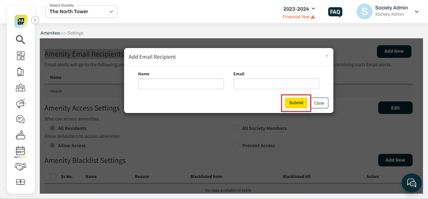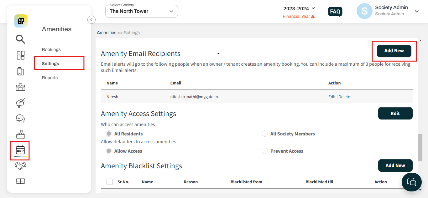 1. Click on the "Add New" option against Amenity Email Recipients under Amenities Settings.