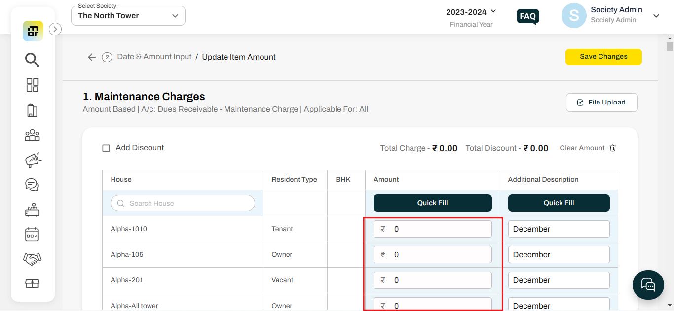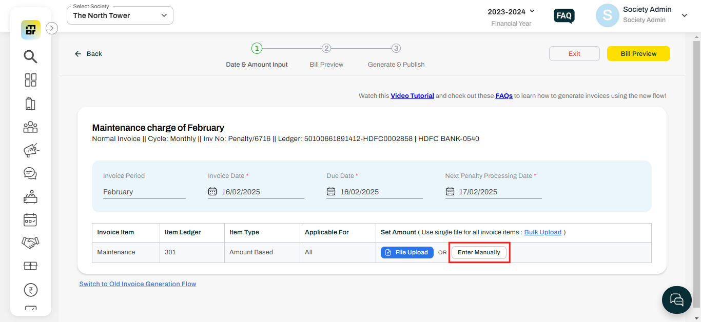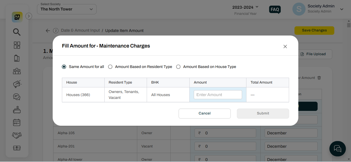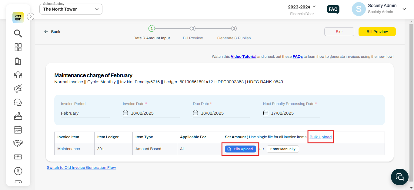 When generating invoices in Mygate, there may be situations where the society needs to assign different amounts to individual flats. Mygate provides the flexibility to input flat-wise amounts manually or in bulk, ensuring accurate billing for each unit.