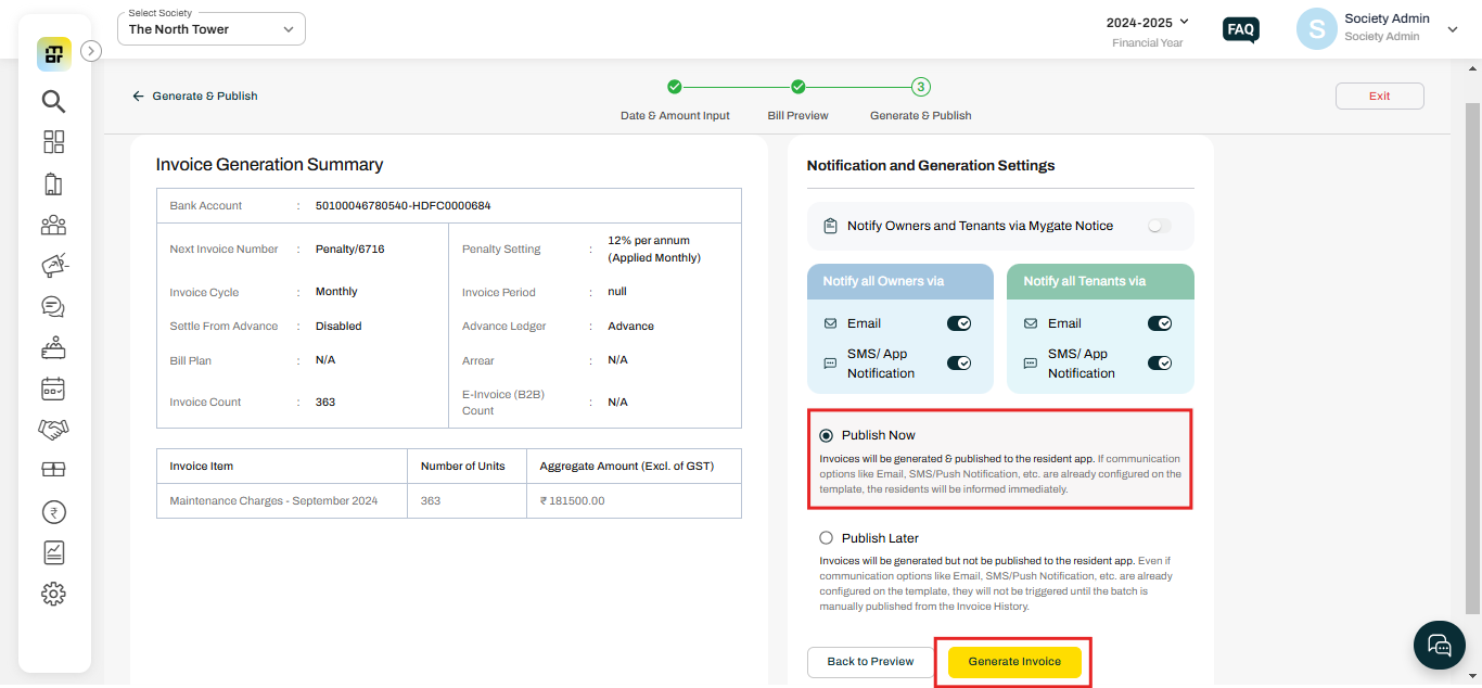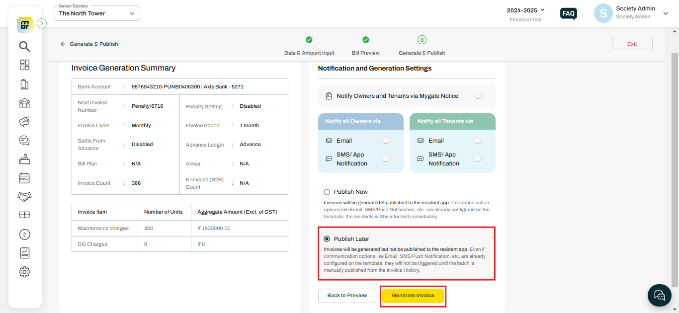 "Publish Now" and "Publish Later" are options in the invoice generation process that provide flexibility to the society management when an invoice is finalized and shared with the residents.