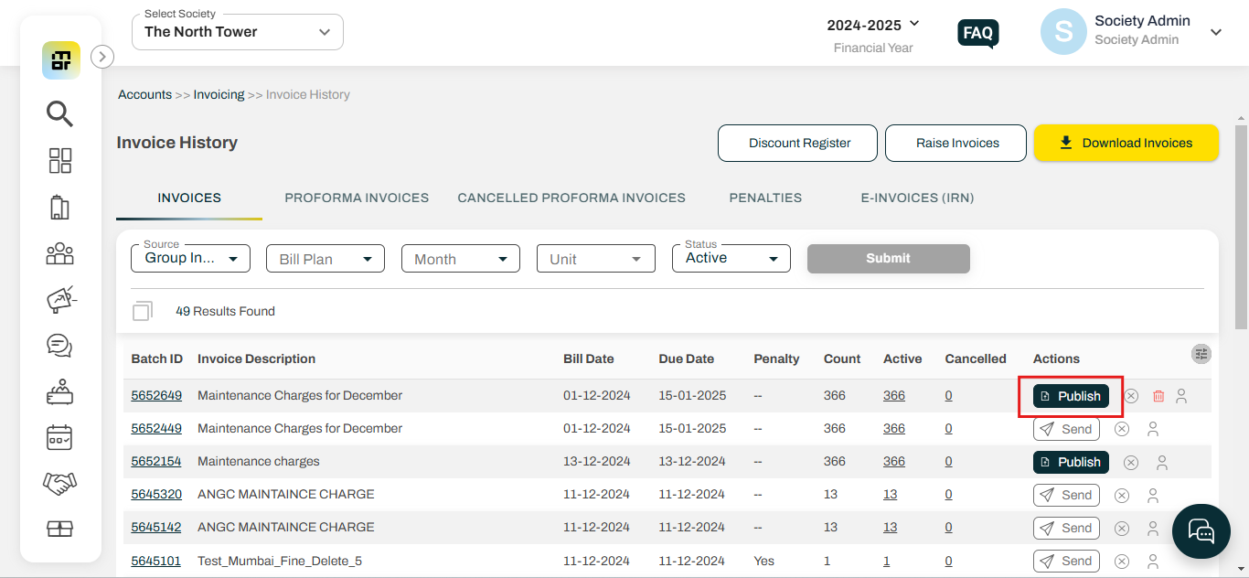 Publish Later: Invoices will be generated but not published to the resident app. Even if communication options like Email, SMS/Push Notification, etc. are already configured on the template, they will not be triggered until the batch is manually published from the Invoice History. It allows the society admin for review, adjustments, or approval before the invoice is finalized.
