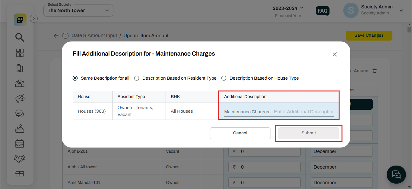 Please refer to the following steps to add additional descriptions for different flats while raising the invoice: