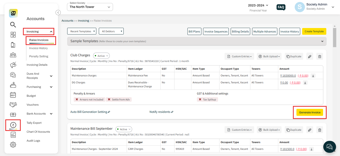 1. Go to Accounts and select Raise Invoices under Invoicing. Then click on "Generate Invoice".