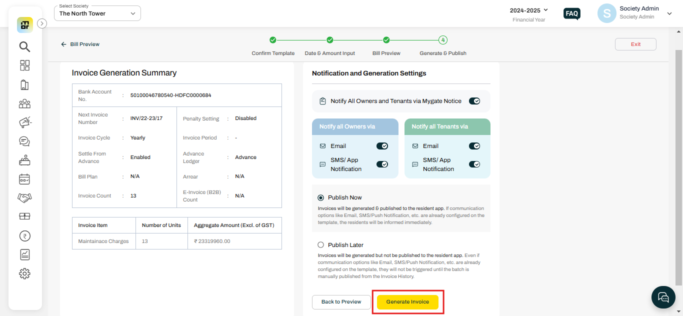 8. In the new preview invoice screen, you can preview the invoice for any flat by using the search option. Once you have verified the details, you can click on "Generate & Publish."