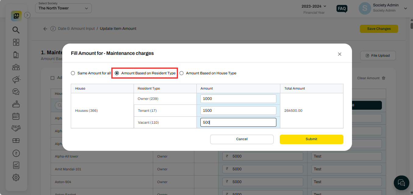 Amount Based on Resident Type: Set the amount based on the resident type. For example, you can set different amounts for owners, tenants, and vacant flats.