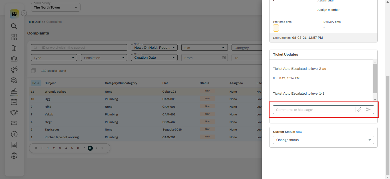In Mygate, if a society admin wishes to draw attention to a specific helpdesk ticket—whether to inform the ticket owner, update assigned staff, or provide important context—they can do so by adding a comment directly to the ticket. This feature allows the admin to communicate updates, share relevant information, or escalate the issue transparently, ensuring all concerned parties are kept informed within the platform.