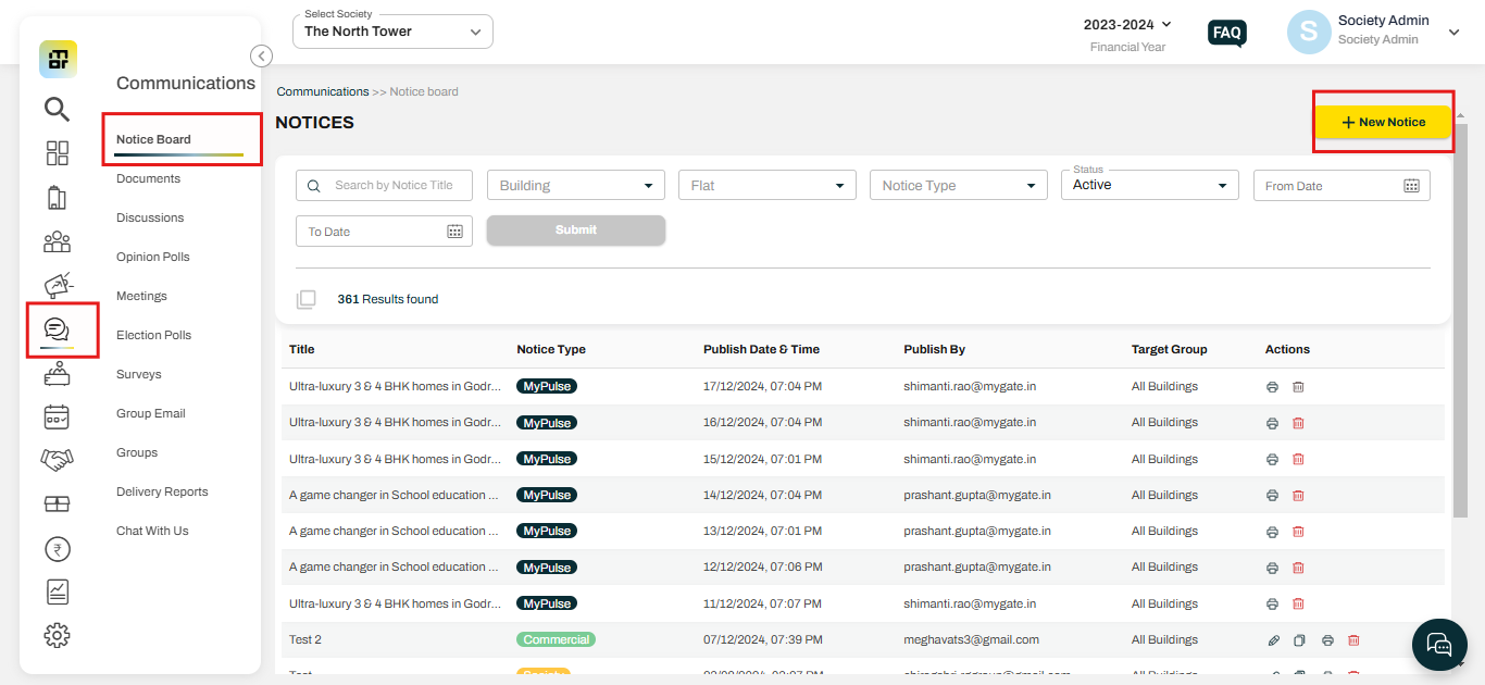 1. Navigate to the Communication section and select "Notice board ", then click on "New Notice".