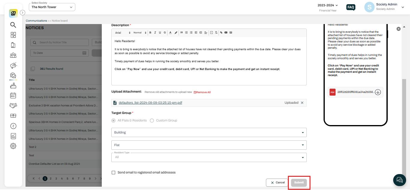 In the Mygate platform, society management can create and send various types of notices to residents, including categories such as Society, Commercial, Events, and Emergency. These notices can be targeted to all residents or specific groups, and are delivered via registered email as well as through the Mygate application.