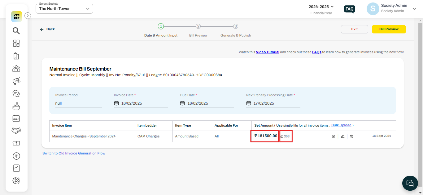 Yes, Mygate provides an option for society admins to view detailed insights related to invoice items. This includes the total amount calculated for a specific charge item and the number of flats it has been applied to. This feature helps in verifying invoice accuracy and understanding how charges are distributed across the society. Follow the steps below to view the total amount of an invoice item along with the number of houses it applies to.