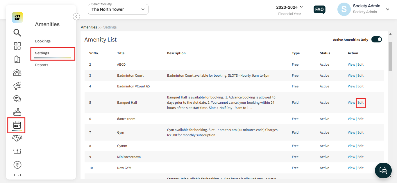1. Navigate to Amenities, click on Settings, and then click Edit for the amenity you wish to configure.