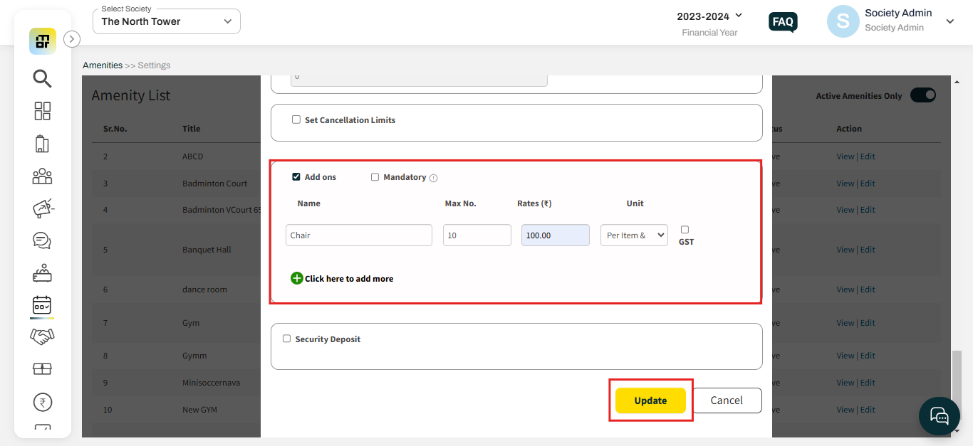 In Mygate, society admins can configure add-ons for amenities—these are additional items or services that residents can request while booking an amenity, such as extra chairs, tables, speakers, or cleaning services. Setting up add-ons helps streamline amenity bookings and ensures that any extra requirements are properly tracked and billed.