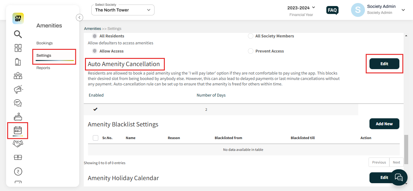 1. Navigate to Amenity, click on Settings, and then select Edit next to Auto Amenity Cancellation.