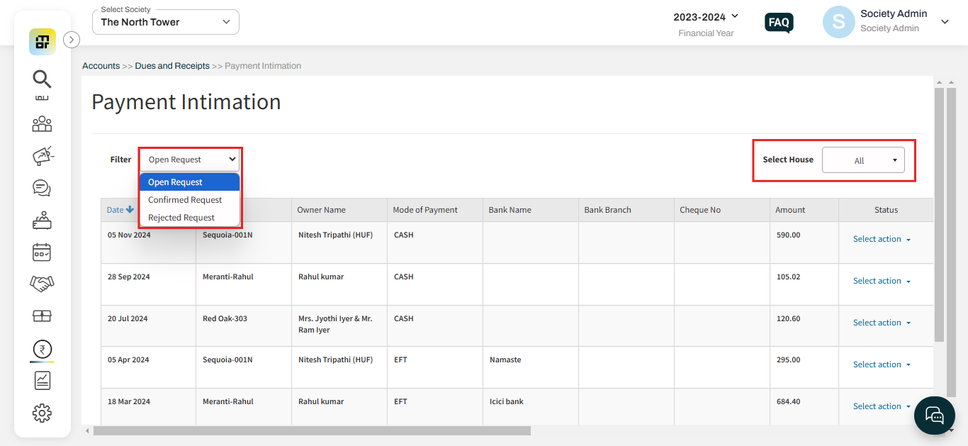b. Reject: You can reject if payment is not received on the Society Bank.