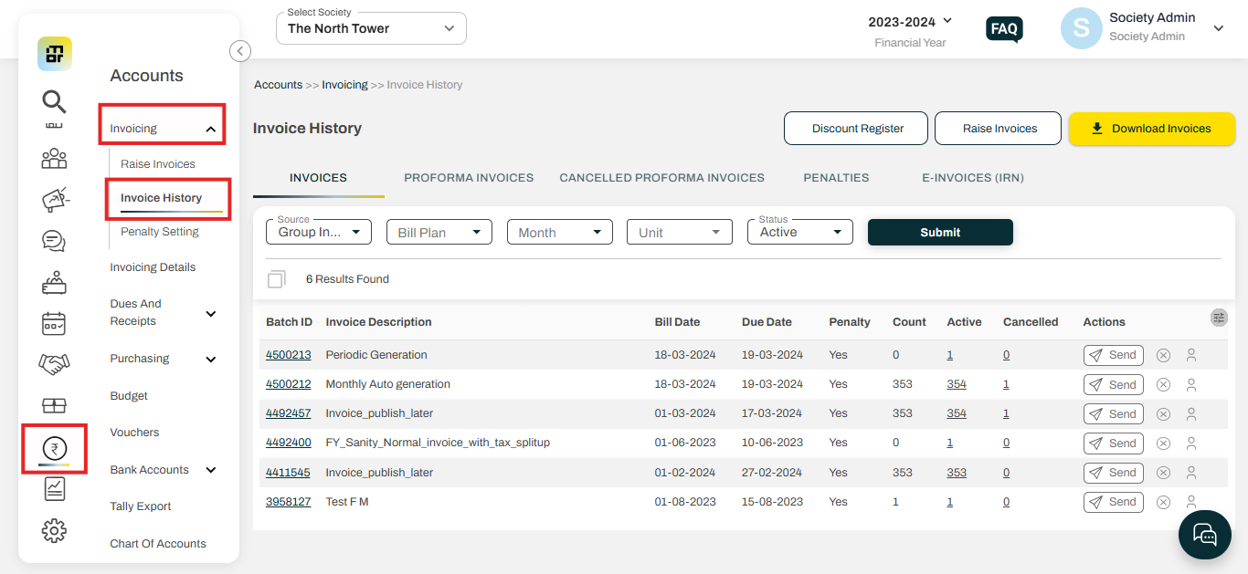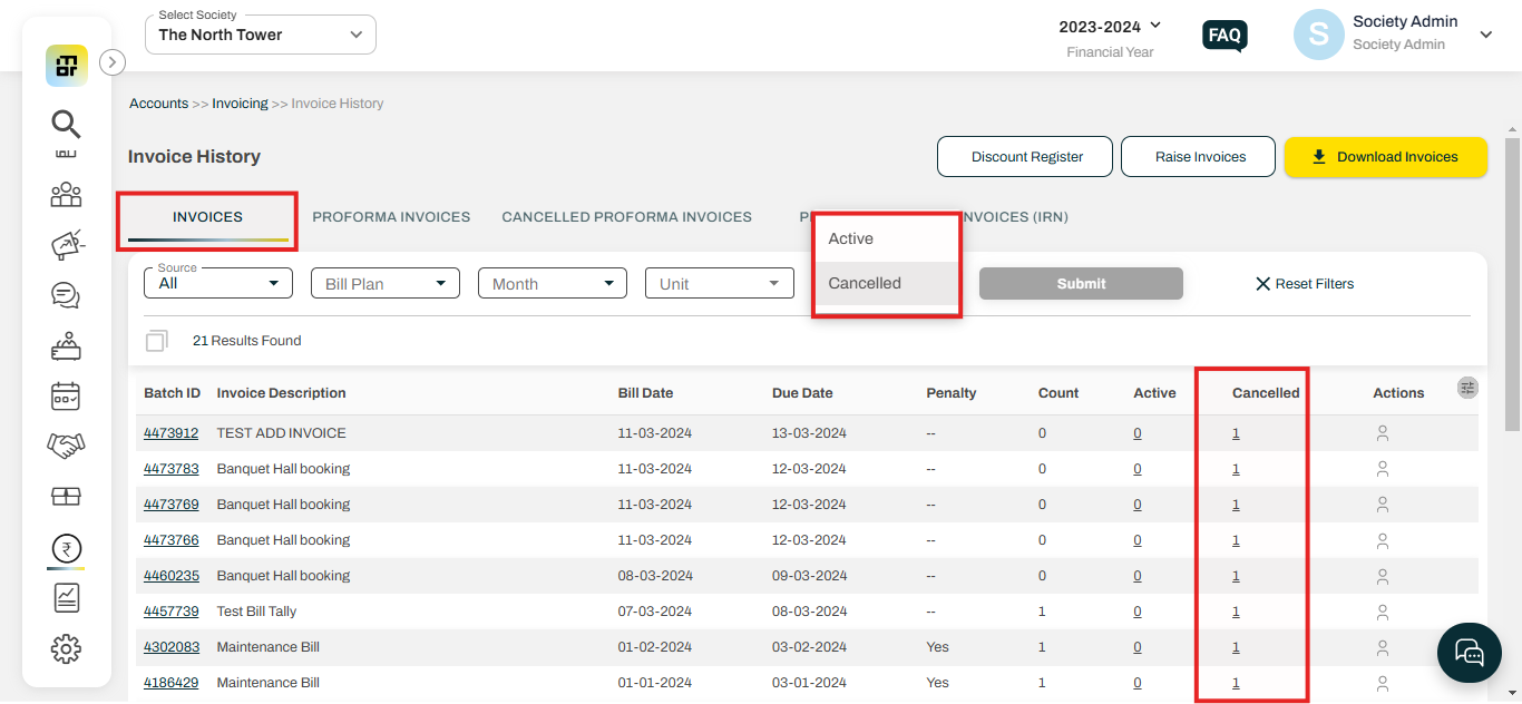 Mygate offers a feature that allows societies to easily track and access details of canceled invoices, providing transparency and better management of billing records. Please follow the steps below to check the canceled invoices:
