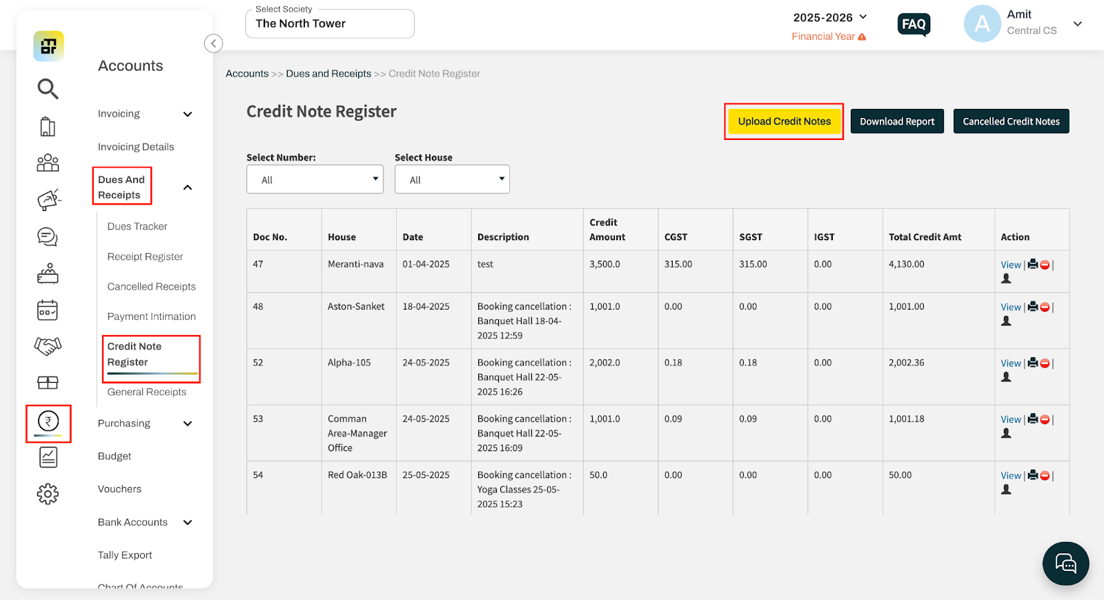 Go to Accounts and select Credit Note Register under Dues and Receipts.