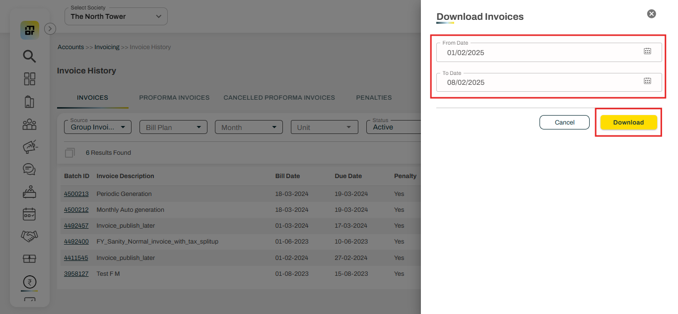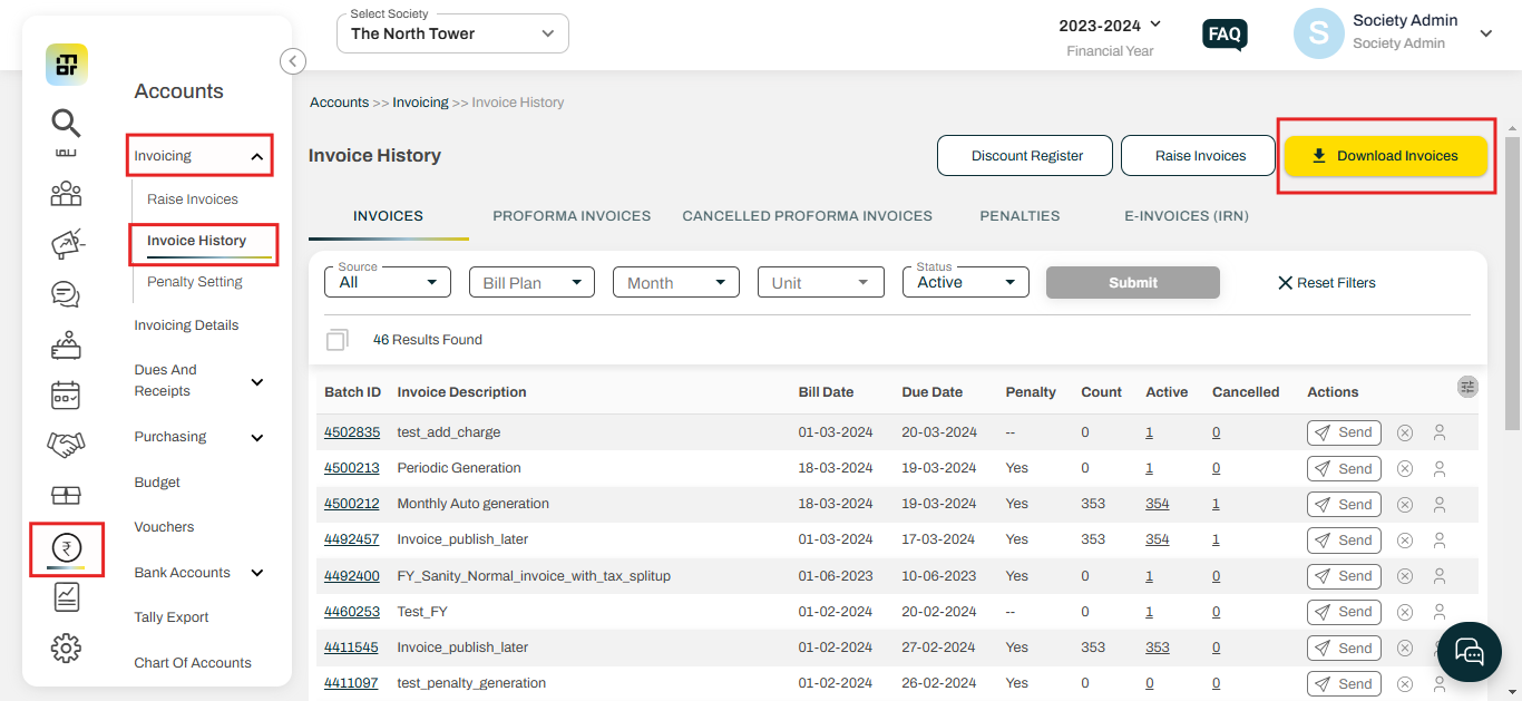 Searching for a specific invoice using its invoice number makes it easy to quickly find and review billing details, verify payments, or address resident queries. This feature helps the society manage records efficiently and ensures transparency in financial operations. Follow the steps below to locate an invoice using its invoice number.
