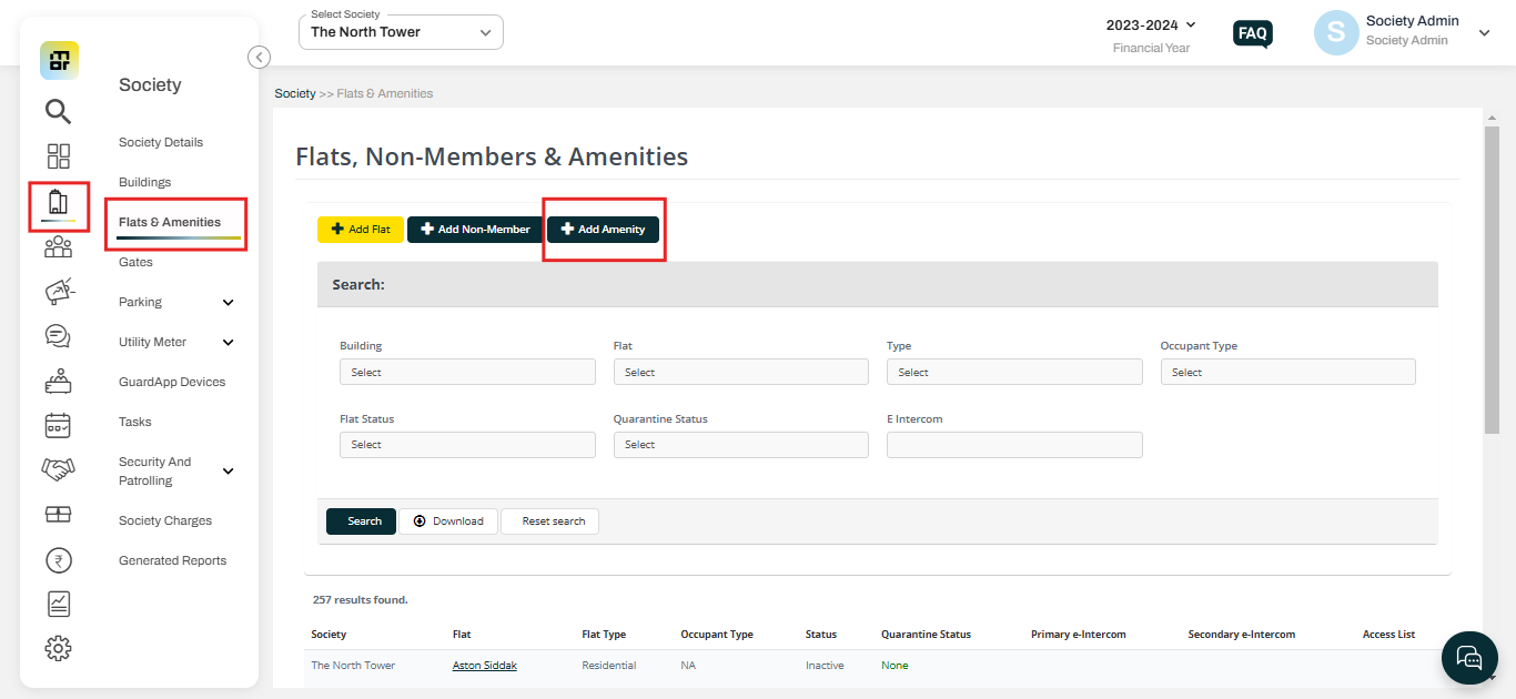 Step 1: The first step is to add an amenity from the admin dashboard. The society admin can navigate to the "Flat and Amenity" section under the Society tab and click on the "Add Amenity" option.
