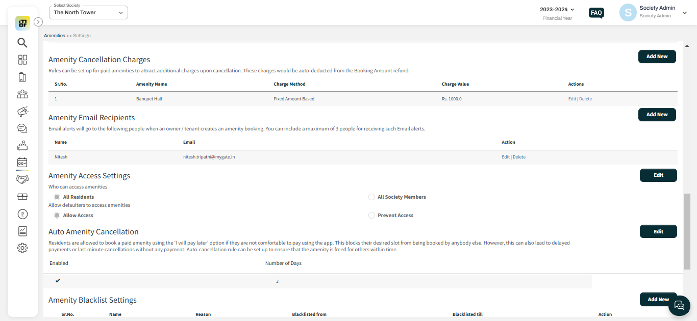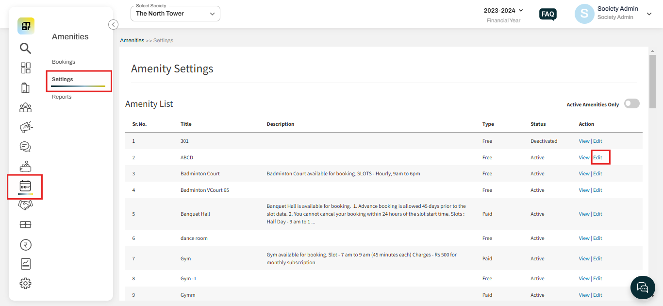 Step 2: Once the amenity is added, the society admin can go to the "Amenities" section and click on "Settings." All added amenities will be visible here. The admin can click on the "Edit" option to configure the necessary rules for each amenity.