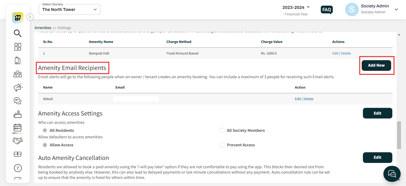 Step 3: After configuring the amenity settings, the society admin can proceed to the "Amenity Email Recipients" section and add the required email IDs. Please note that if no email ID is added here, the amenity booking email will be sent to all admins by default.