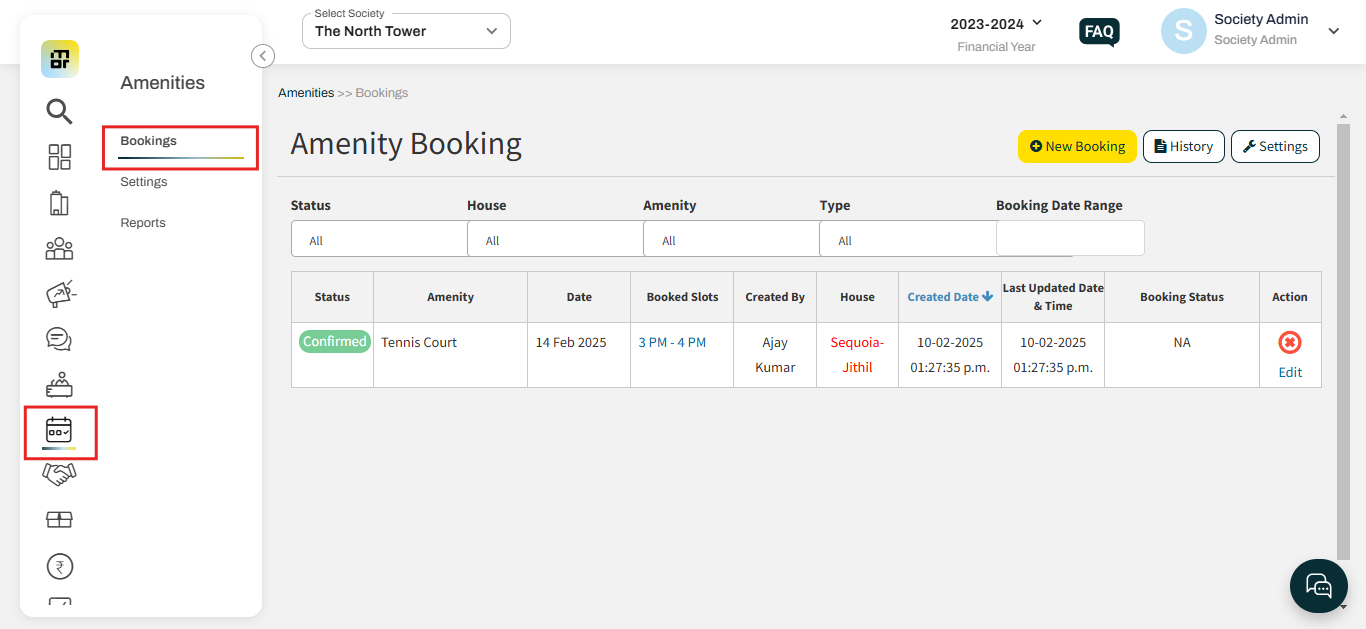 Once the amenity is booked by the resident, the society admin can view the booking details by navigating to Amenities > Bookings.