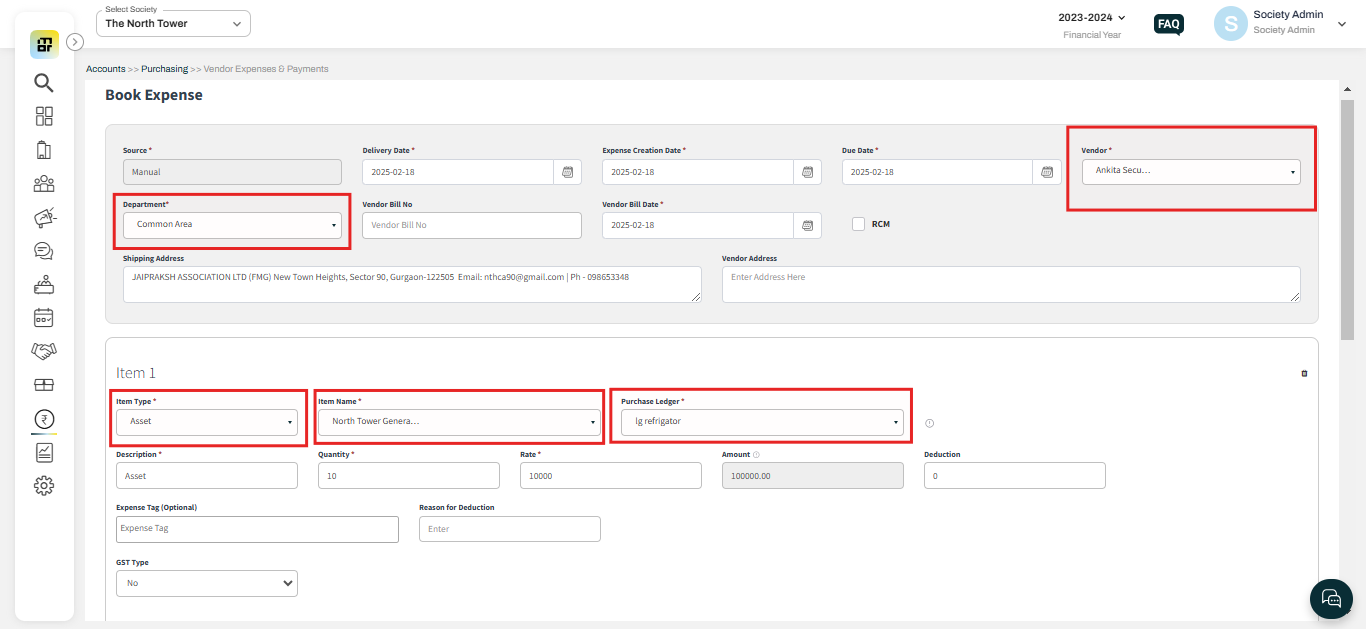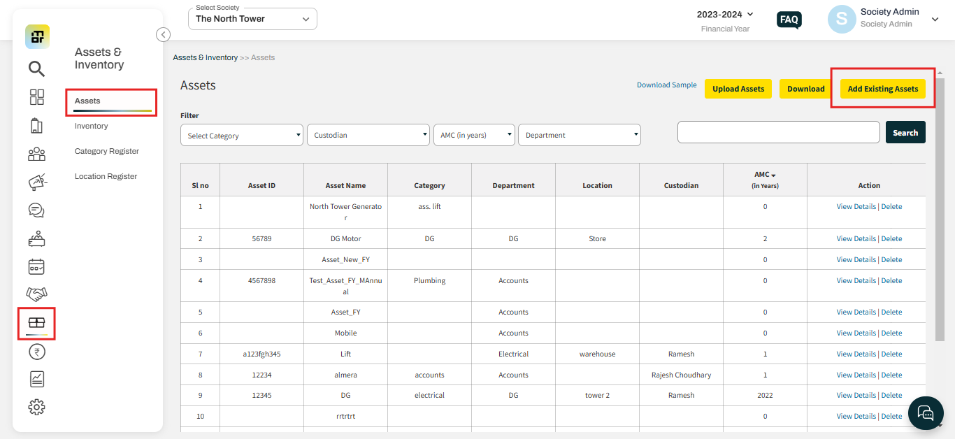 Location: Society can tag a location for the asset. society can add a new location by following the steps, Go to Asset & inventory select Location Register, and click on Add New Location.