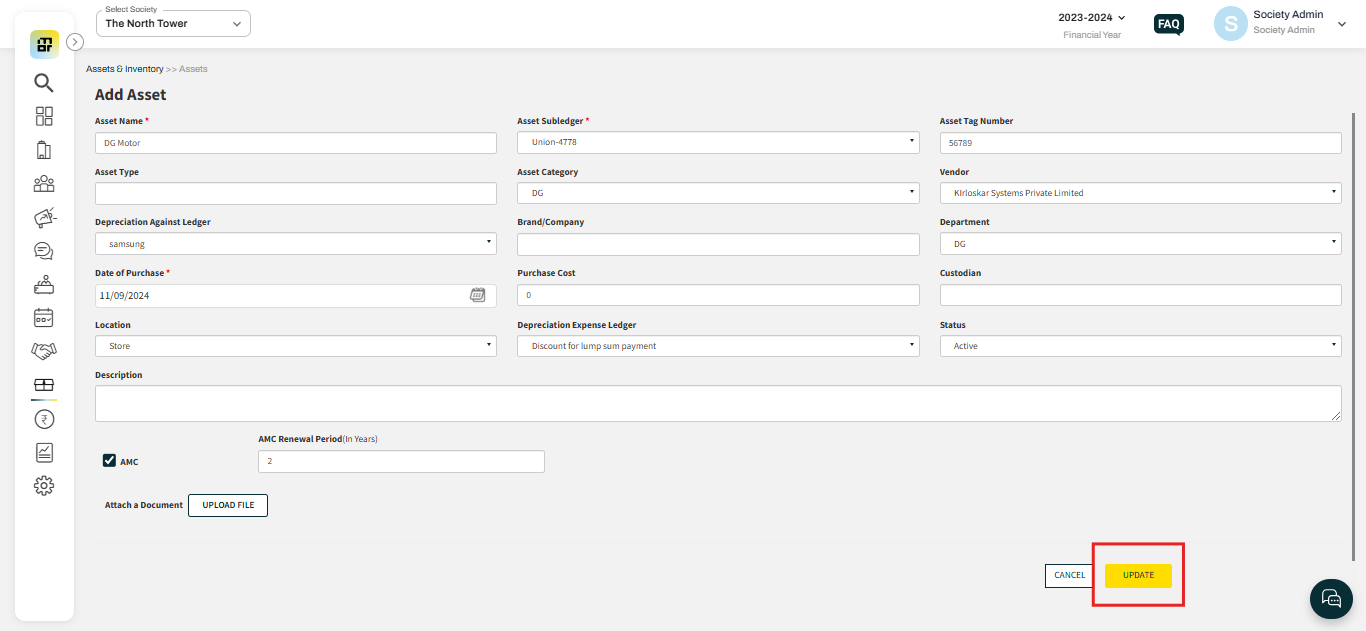 Status: Society can mark the Asset status as active or Inactive as per the usage.
