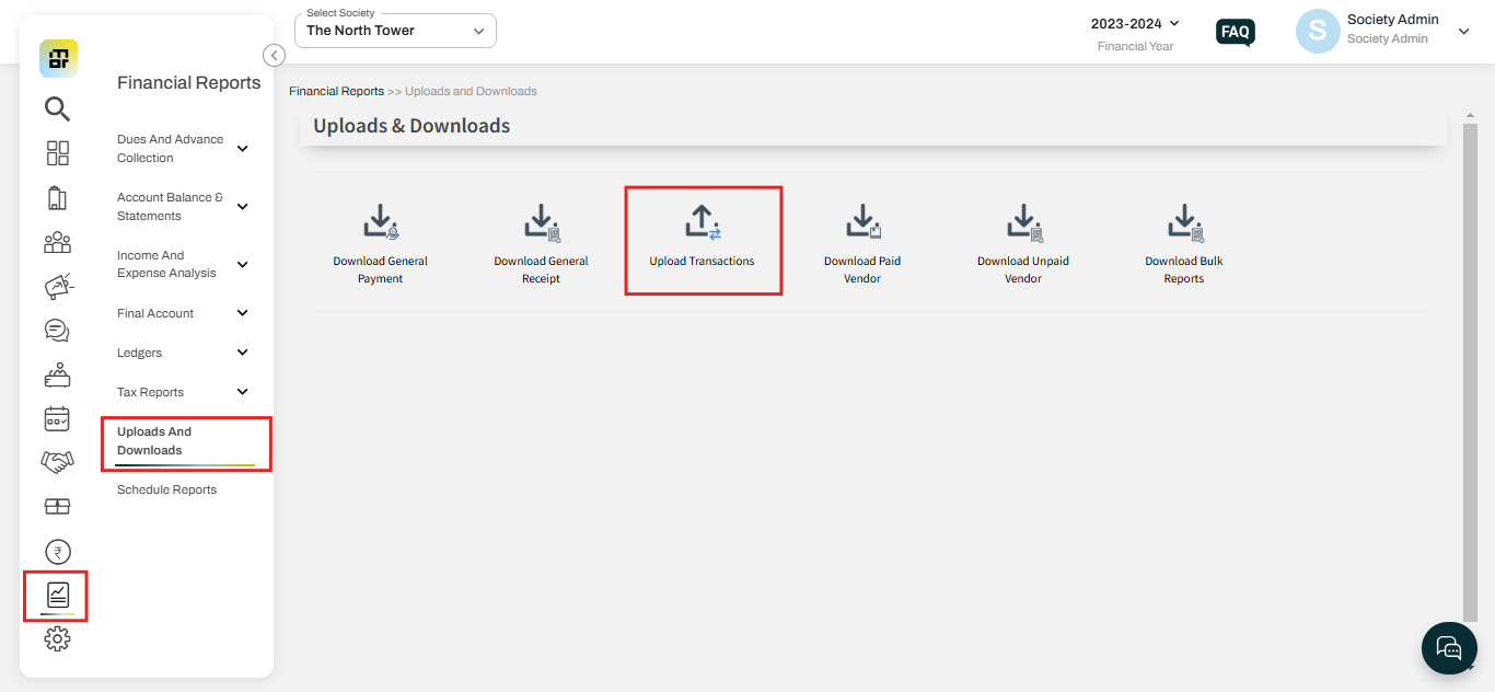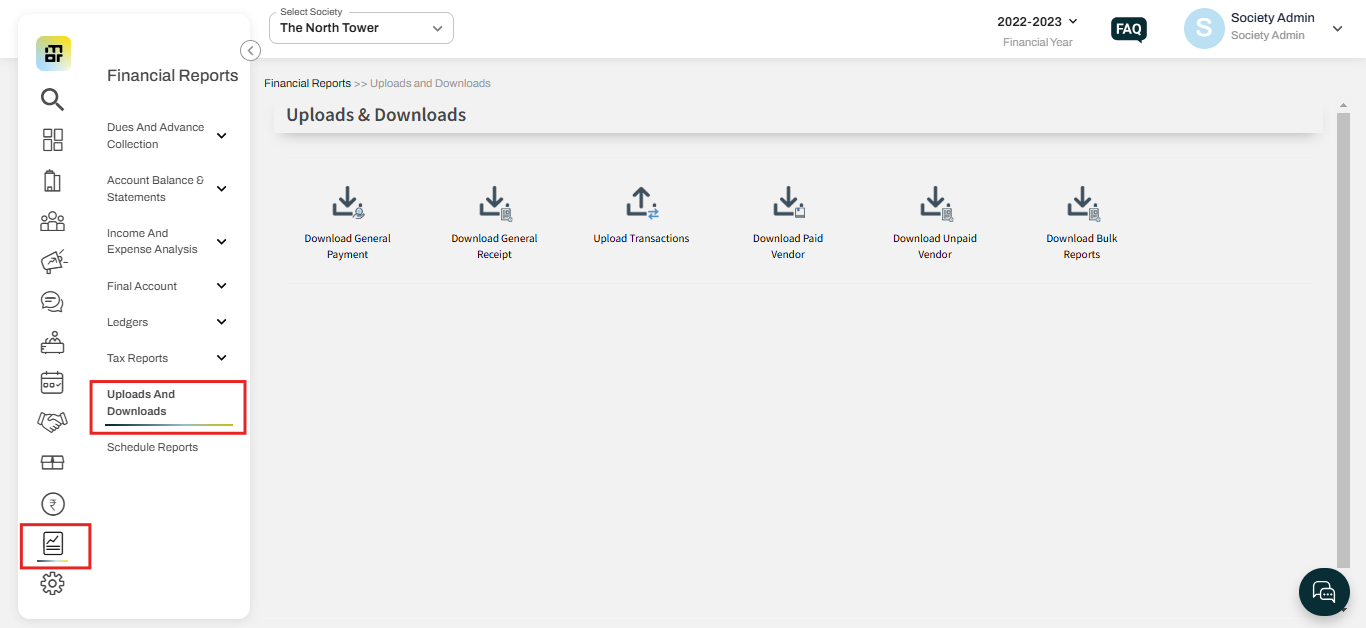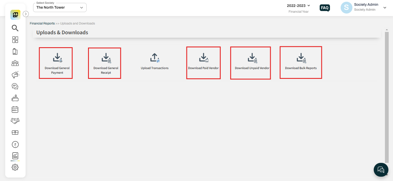 Society can download multiple reports here, including General payment, General receipts, paid vendor, unpaid vendor, and bulk reports as well.
