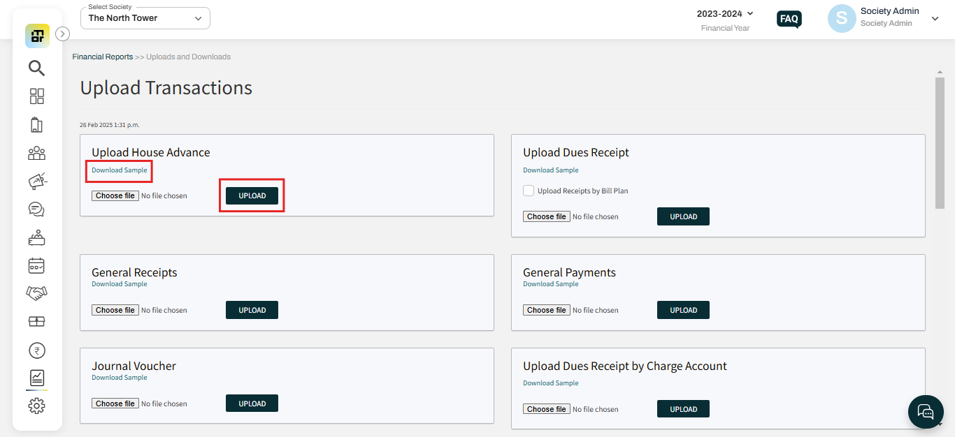 1. Upload House Advance: The society can upload house advance entries for each flat in bulk using this option. Download the sample file for uploading the house advance, fill in the details, and then upload the completed file.