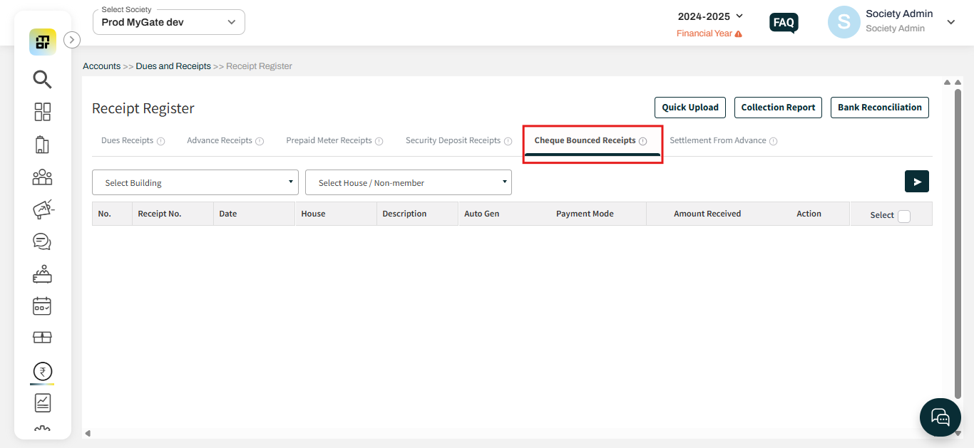 Click on the Cheque bounced receipts section. You can filter it using building, flat, or payment method as well.
