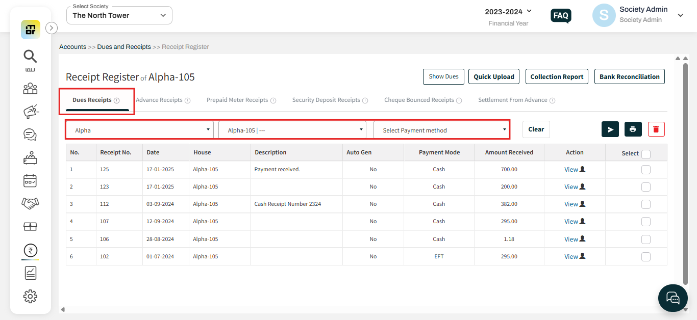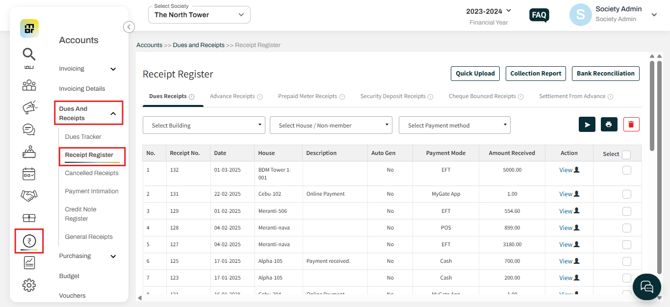 a. Go to accounts and select Receipt Register under Dues and Receipts.