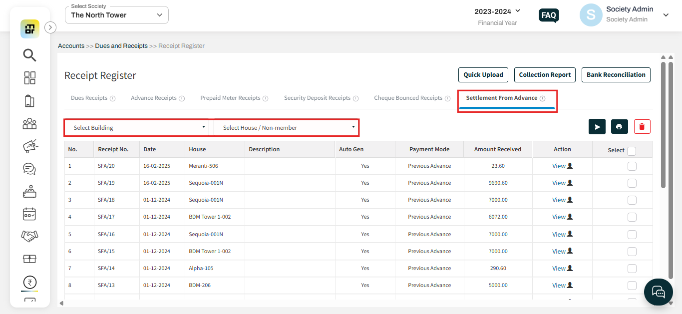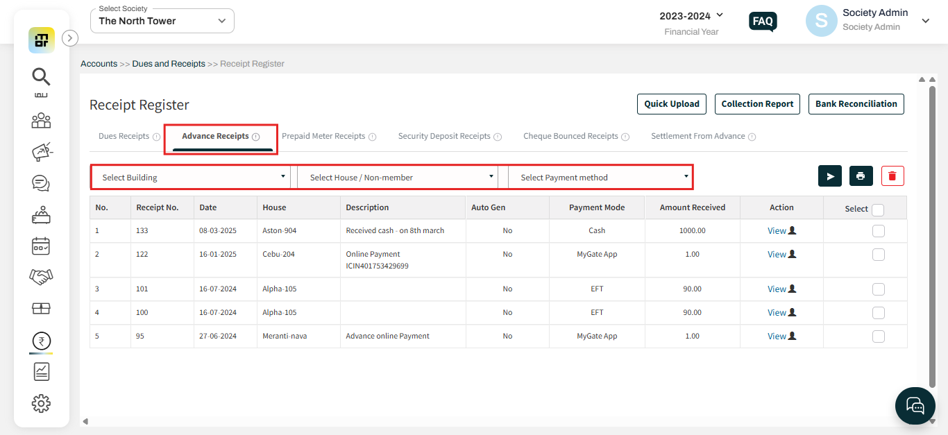 Click on the Advance Receipt section. You can filter it using building, flat, or payment method as well.