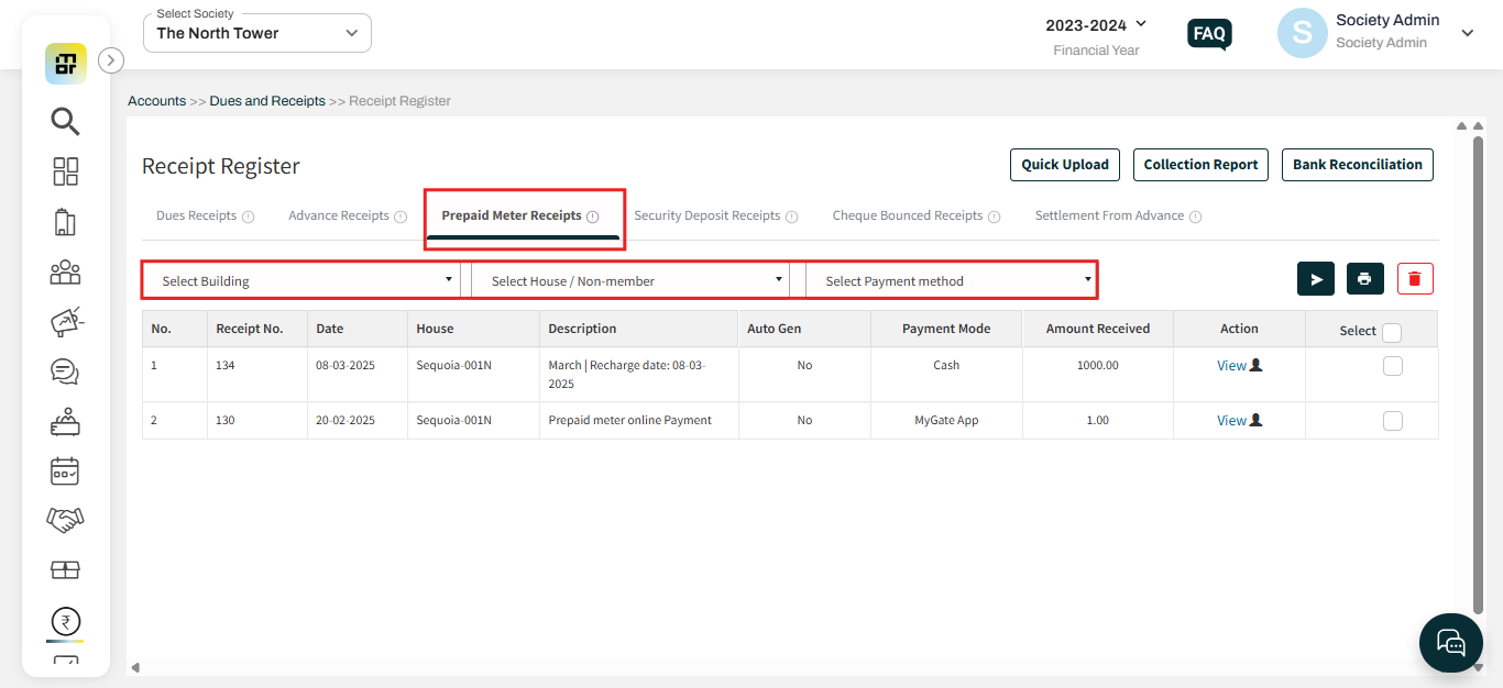 Click on the Prepaid Meter Receipts section. You can filter it using building, flat, or payment method as well.