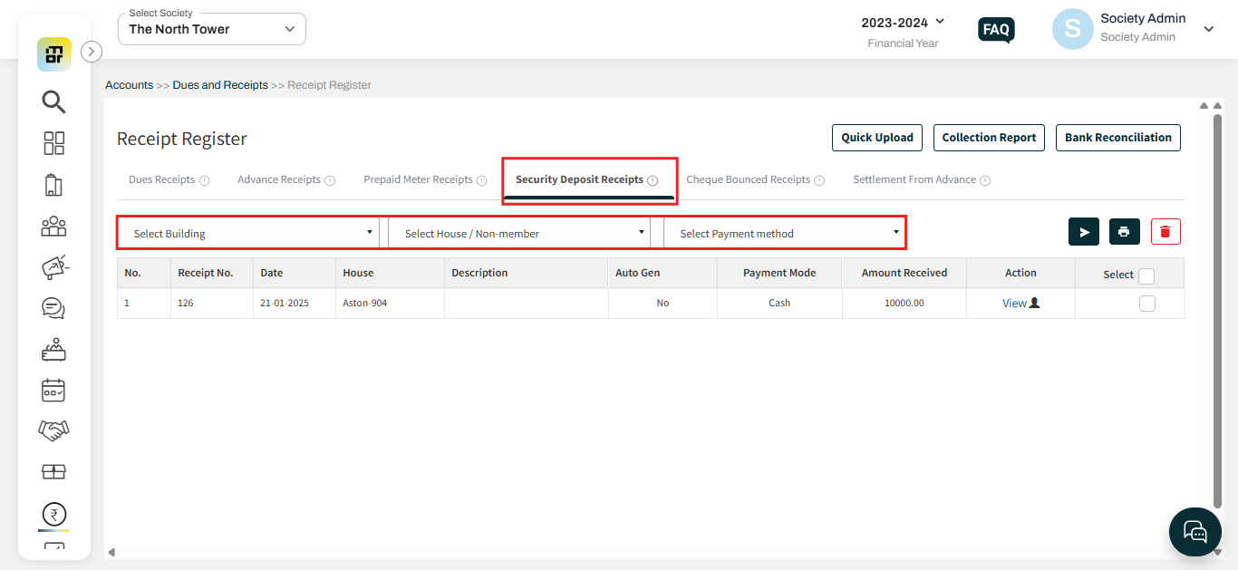 Click on the Security Deposit Receipts section. You can filter it using building, flat, or payment method as well.