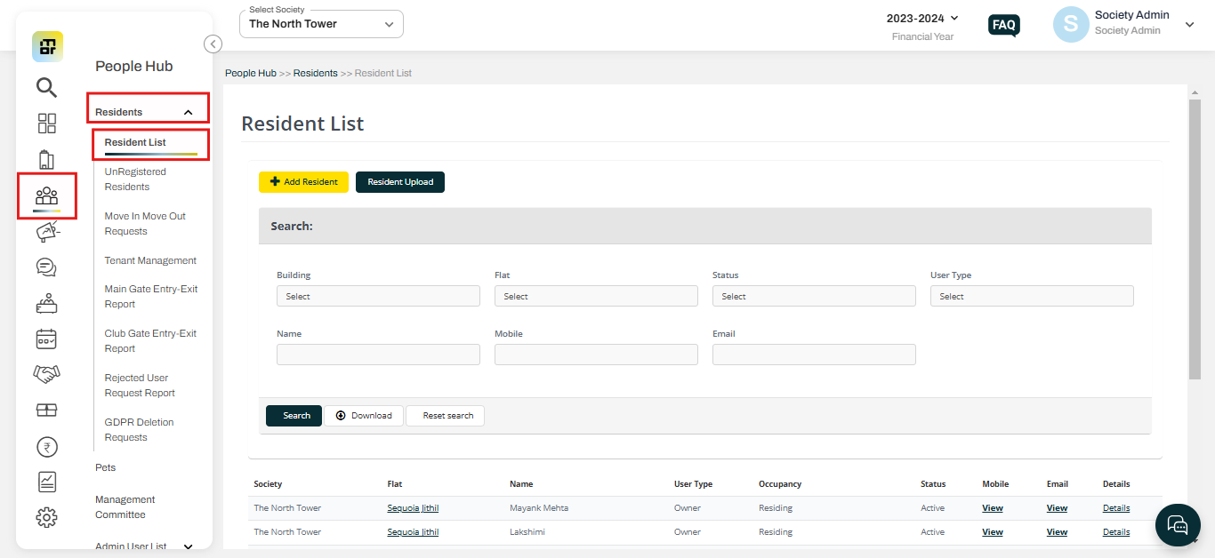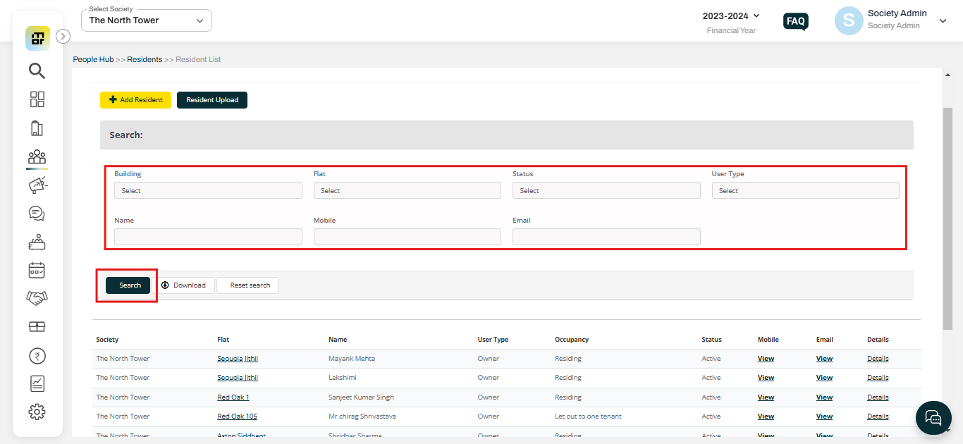 2. You can filter with building, flat, name, mobile number, or email ID and click on submit.