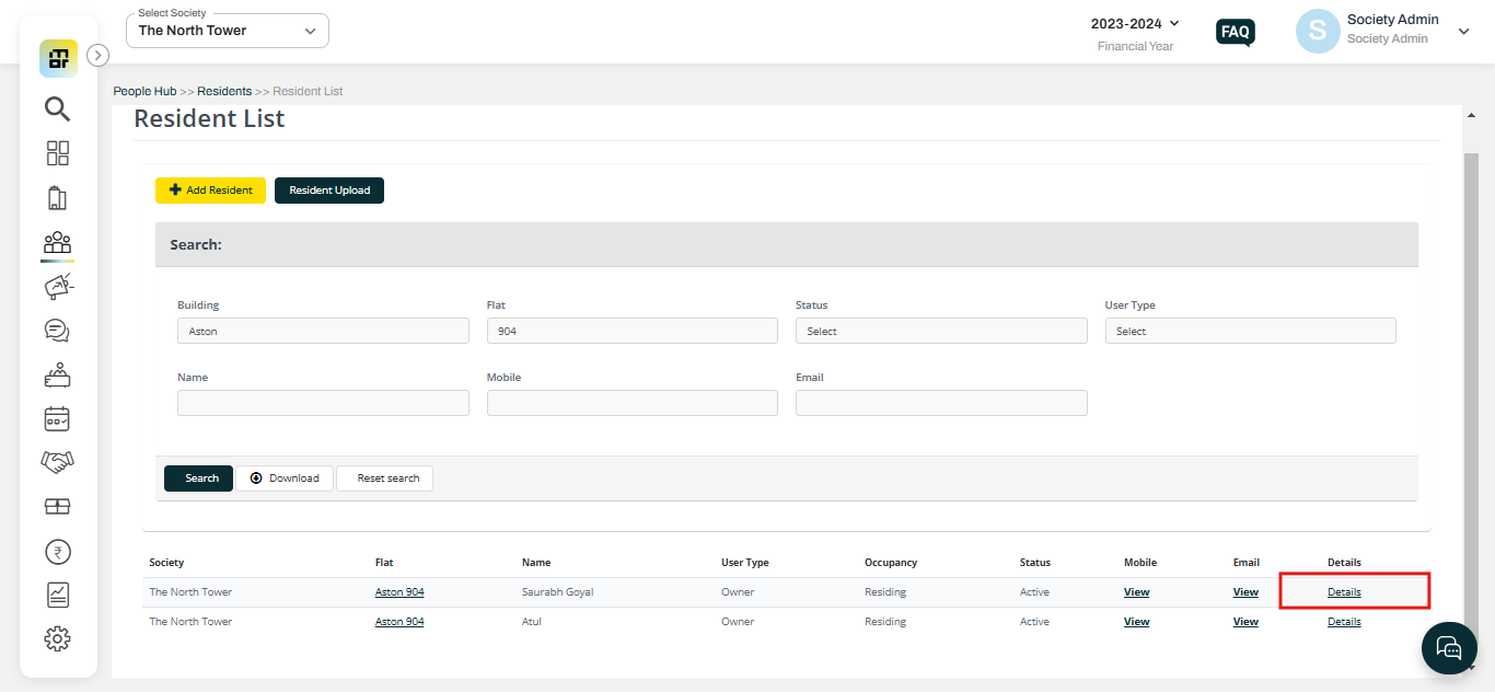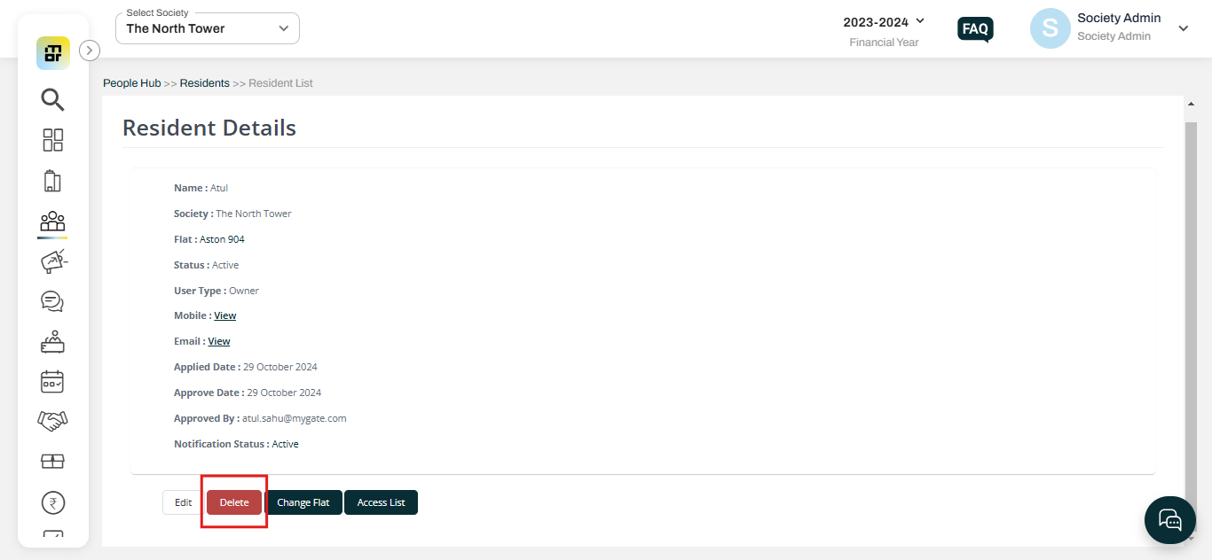 In Mygate, society admins have the option to delete a non-member from the system when they are no longer associated with the society. These individuals could be property owners of commercial spaces (like shops) or owners of other properties within the society.