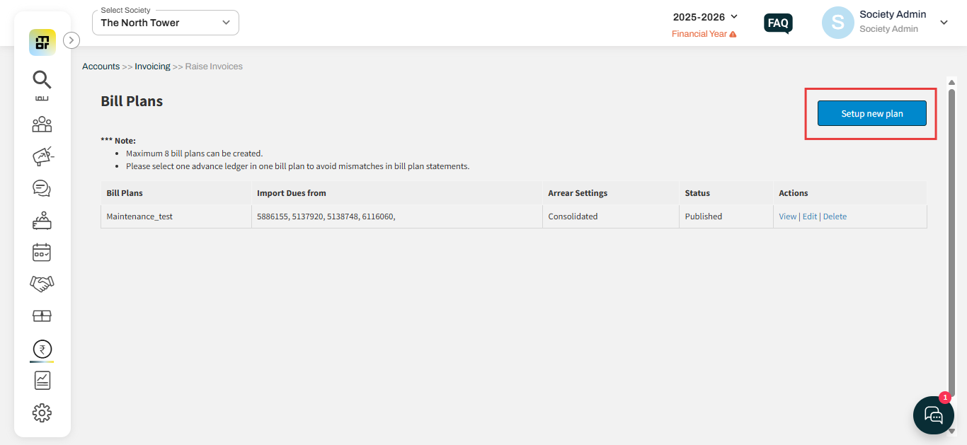 1. Go to accounts, select Raise Invoices under Invoicing. Then click on Bill plans.